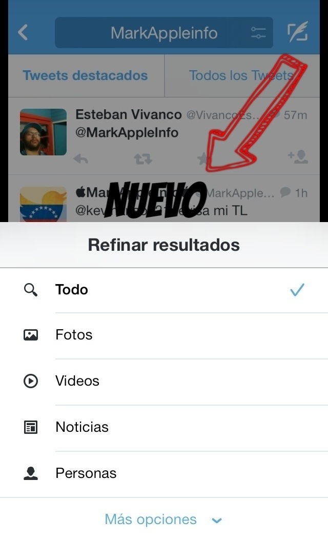 Si van al buscador de Twitter, podrán ver un nuevo icono que son como dos rayas con un punto. Si pisas ahí se abrirá un menú, y ese menú es la nueva característica de esta versión. En ese menú podrás hacer un filtro de tu búsqueda para que encuentres la foto, video, noticia más rápido.
