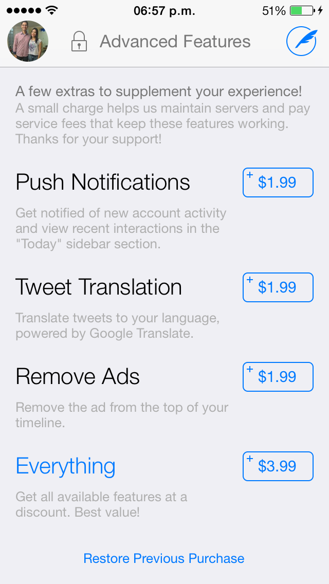 Ahora tenemos un nuevo apartado en la aplicacion, aquellos que esten familiarizados con la aplicacion lo notaran. El apartado lleva por nombre: Configuracion avanzada (o Advance Features). Al entrar como podemos ver en la foto no es mas que un apartado dedicado a las compras in-app, ahi encontraremos 4 opciones de compra: Notificaciones Push, Tweet Translation, Remover publicidad y una compra final que nos ofrece todas estas opciones en una.
