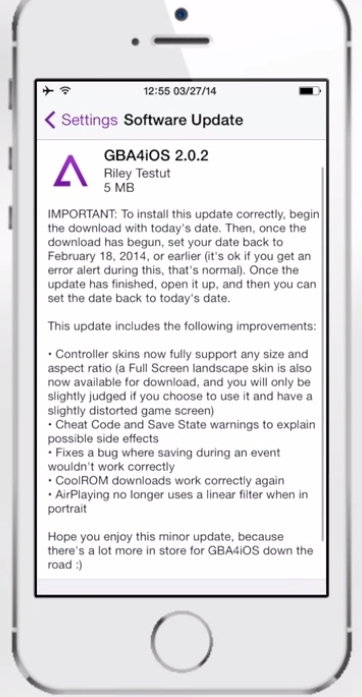 Si deseas descargarla en tu iDevice, solo tienes que ir al siguiente enlace: GBA4iOS (Nota: con la actualización a la versión 2.0.2, debemos pasar la fecha del dispositivo a una anterior al 18/02/2014, al finalizar la descarga abrir la aplicación y luego podremos restaurar la fecha real).