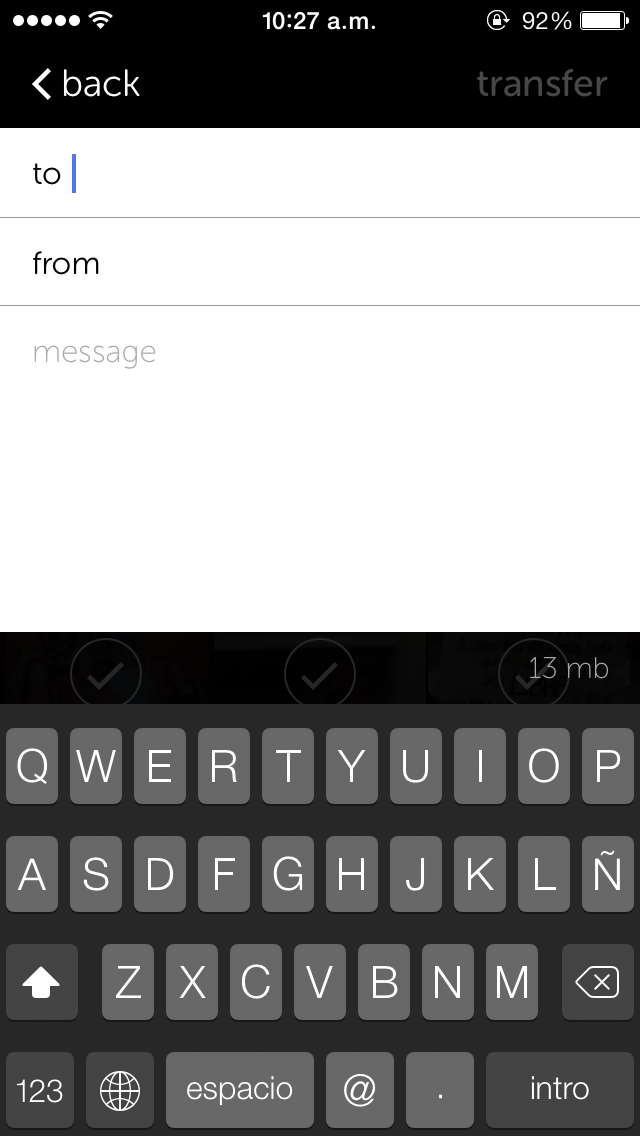 Su uso es tan simple como: Descargar la aplicación, seleccionar las imágenes o vídeos que queremos enviar desde nuestro carrete, teniendo la posibilidad de enviar hasta 10gb, fijándonos en la esquina superior izquierda veremos un contador el cual nos indica el peso total de lo seleccionado para enviar (Un poco difícil pasarse de 10gb si me preguntan), elegimos la pestaña siguiente (Ver imágenes debajo) y a continuación se nos mostraran las casillas donde tendremos que poner los datos del correo al que queremos enviar los archivos, el correo desde el cual los mandaremos y un mensaje para la persona que lo recibe y listo, muy sencillo pero muy útil al mismo tiempo.