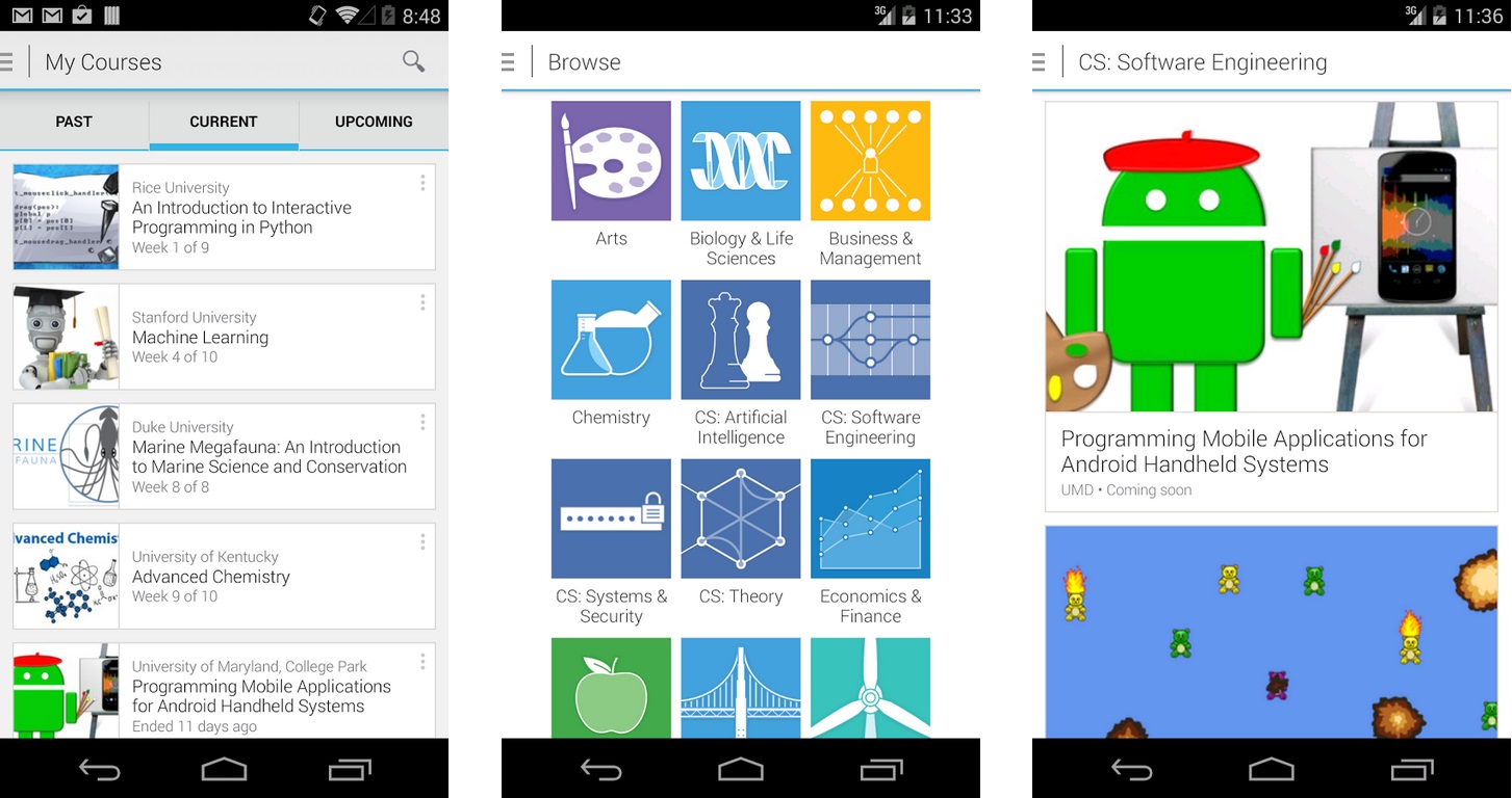 Ahora Coursera llega gratuitamente a los dispositivos con Android desde su versión 4.0 Ice Cream Sandwich en adelante, todo el que posea dicho sistema podrá disfrutar de esta ingeniosa aplicación que nos lleva por un mundo educativo y profesional como ninguno.