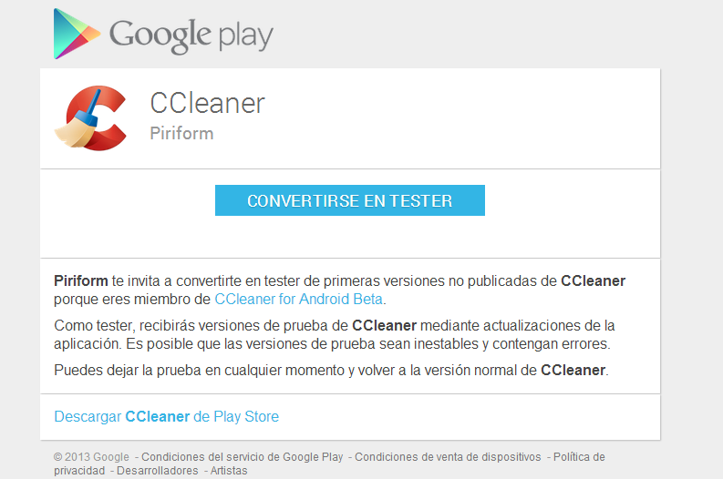Todos los que quieran probar la versión beta pueden unirse a la comunidad de Piriform en Google+, al ser parte de la comunidad van al enlace Become a Tester al estar en la siguiente ventana le dan click en «Convertirse en tester» y listo, ya podrán ir a la Google Play y descargar CCleaner para Android.