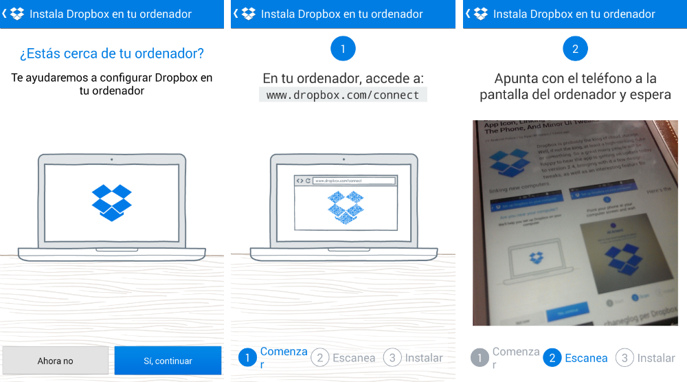 Ahora Dropbox nos permite sincronizar nuestro PC con nuestro dispositivo Android. Tan solo con el uso de la cámara de nuestro dispositivo y un codigo QR que nos provee la pagina oficial de Dropbox Connect, podremos sincronizar todos nuestros documentos desde nuestro Android a la PC.