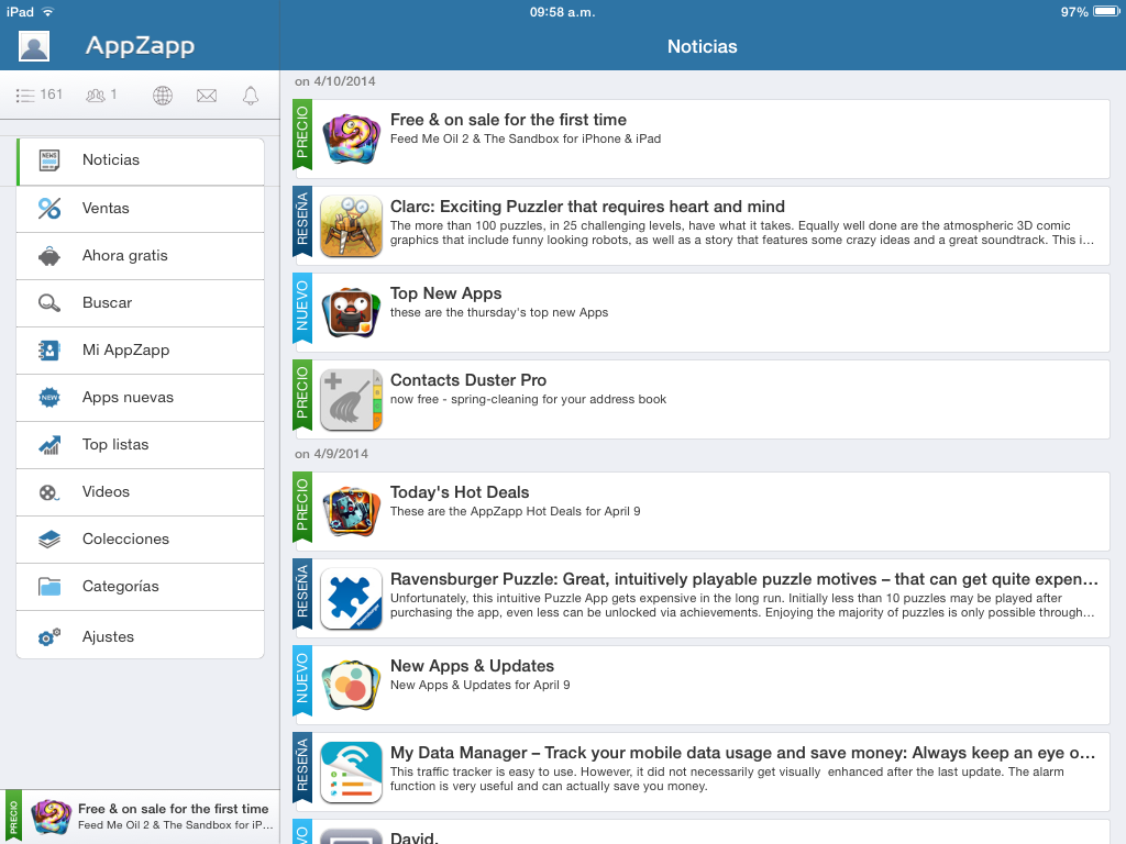 Otra categoria interesante es la de «Noticias», donde dia a dia publican lo mas relevante, es decir aplicaciones populares que se vuelven gratuitas, ofertas, el top del dia, el top de nuevas aplicaciones y actualizaciones, reseñas, en fin un apartado que no pueden dejar de ver todos los dias.