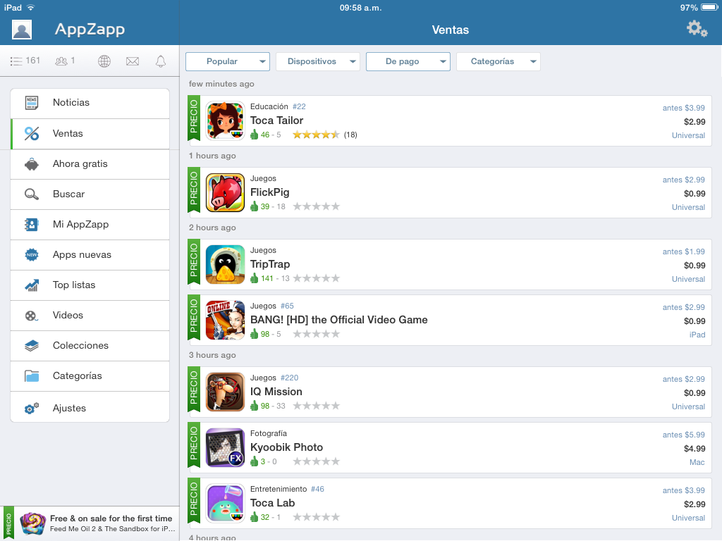 Hoy les traigo una aplicación que no tiene otra descripción sino magnifica, es AppZapp, no dudo que para muchos sea desconocida, ya que para iPhone fue eliminada de la App Store hace ya algunos meses (Apple no promueve este tipo de apps). Dicho esto, aun permanecen intactas las versiones para iPad y para Android y si eres de esas personas que como muchos no le gusta pagar o no tiene el dinero para hacerlo, esta aplicación es para ti, ya que con ella podrás hacer seguimiento a cualquier app y saber cuando esta esta gratuita, presenta una reducción en su precio y mucho mas.