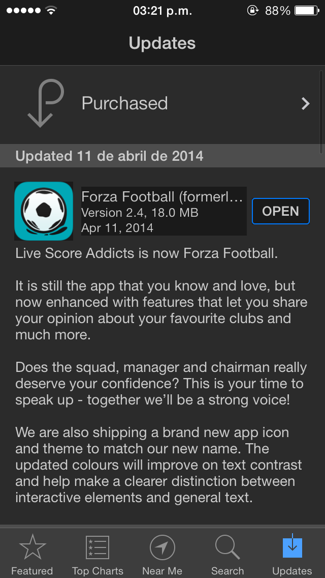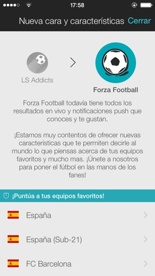 Hoy a saltado la actualización de LS Addicts, con la cual la aplicación pasa a llamarse Forza Football, esto no es de sorprender ya que la gente de FootballAddicts realizo mediante la aplicación una encuesta acerca de un nuevo nombre, acerca de dicha encuesta la empresa comento que recibieron cerca de 10000 votos, de los cuales la mayoría los obtuvo el nombre de Forza Football.