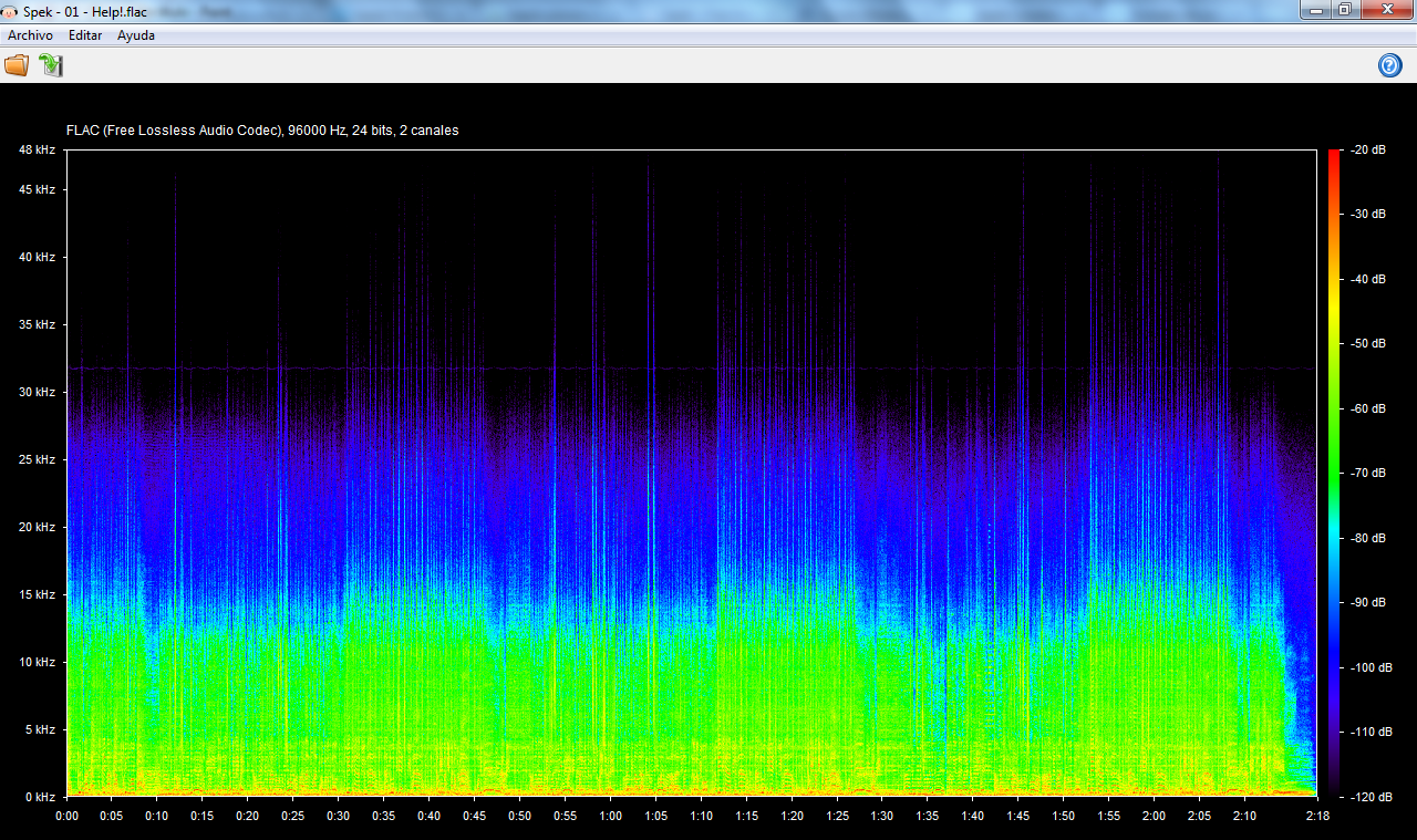 Acá podemos observar como el rango en la escala de la parte izquierda es muchísimo mayor y el espectro es mas nítido y versátil, toda la información perdida anteriormente al ser convertida a MP3, ahora la podemos ver reflejada al ser convertida a FLAC, el mínimo detalle de grabación sonora en este tema de The Beatles puede ser ahora escuchado en este formato de alta definición.