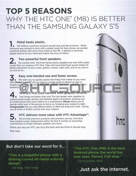 Los dos grandes móviles de gama alta del mercado, el HTC One M8 con su magnífico acabado de metal y el Galaxy S5 con su plástico en la parte trasera que imita al cuero se enfrentan, pero esta vez HTC ha hecho unas imágenes diciendo que el One M8 es mejor que el Galaxy S5 por 5 razones…