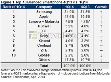 Apple, a mi parecer se lleva más mérito por haberse mantenido en segundo puesto solo sacando dos teléfonos (sé que que todavía esta en venta el iPhone 4s en algunos países pero hablo de los más recientes) el iPhone 5S y 5C y ambos siendo de alta gama y un alto precio.