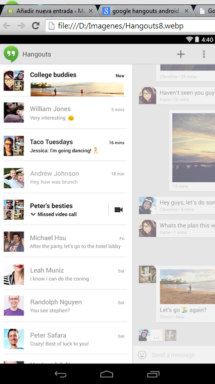 - Conversaciones unificadas SMS/Hangouts: las conversaciones de SMS y Hangouts se encuentran ahora en la misma ventana de chat. Se puede controlar el envío de un mensaje a través de Hangouts o SMS con un simple gesto, y los diferentes tipos de mensajes serán más fácil de diferenciarse en la conversación. También se puede juntar o separar las conversaciones tal como queráis.
