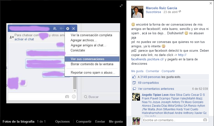 Una vez que sabemos como se originan y el por qué de su funcionamiento, pasamos al nuevo caso que acecha a Facebook. Su funcionamiento es similar a lo antes explicado. Cada vez que entramos a la web que se indica debajo y seguimos los pasos terminaremos enviando mensajes como muestra la imagen de abajo a todos nuestros contactos.