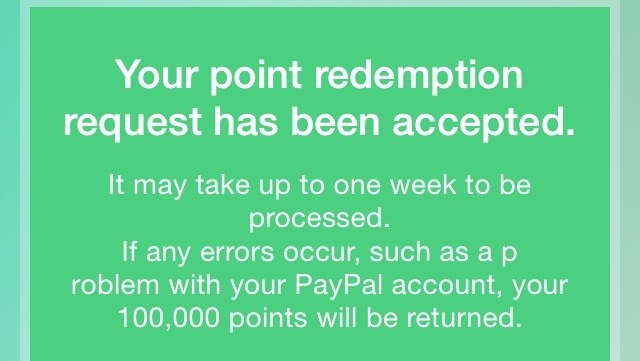2. Hola Mark. Acabo de comprobar que no es semanal el pago. Podemos seguir canjeando los 100 000 puntos diarios. Cada solicitud de canje «puede» tardar una semana en acreditarse en la cuenta paypal. Ayer hice solicitud de canje, y en la noche me llego el dinero. Hoy hice otra solicitud de canje, la cual según Peko, puede tardar hasta una semana en verla transferida. Saludos