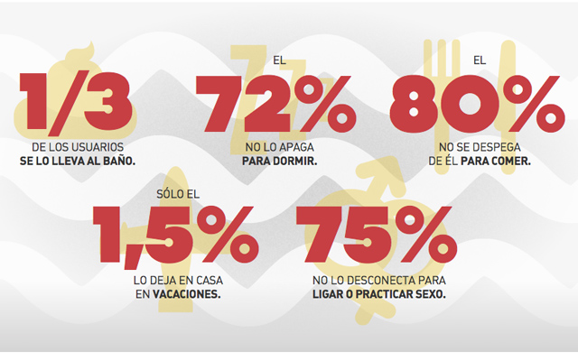 Un estudio realizado en España por la pagina TheAppDate nos menciona que la gran razon de este incremento es porque el movil se ha apoderado de nuestras relaciones interpersonales tanto asi, que incluso cuando tenemos relaciones sexuales nuestro movil esta a nuestro lado activo, por no decir ademas que forma parte de nuestros comensales a la hora de comer.
