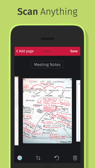 Como podemos ver tiene integración con servicios como Dropbox, Drive, Evernote, OneDrive, Box, entre otros. Posee un sistema de detección de bordes y escaneo, un diseño mas que bonito y una rapidez increíble. Con la posibilidad de escanear cualquier cosa, ademas de la promesa de que añadirán mas servicios de la nube próximamente esta aplicación es sin duda una que no puedes dejar de probar.