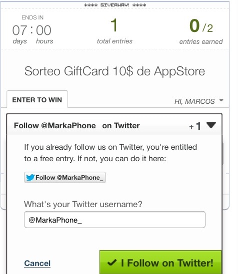 2- Deberán pisar en «Follow @MarkaPhone_ on Twitter» y colocar su usuario de Twitter. Luego pisar donde sale el pajarito de Twitter (arriba)
