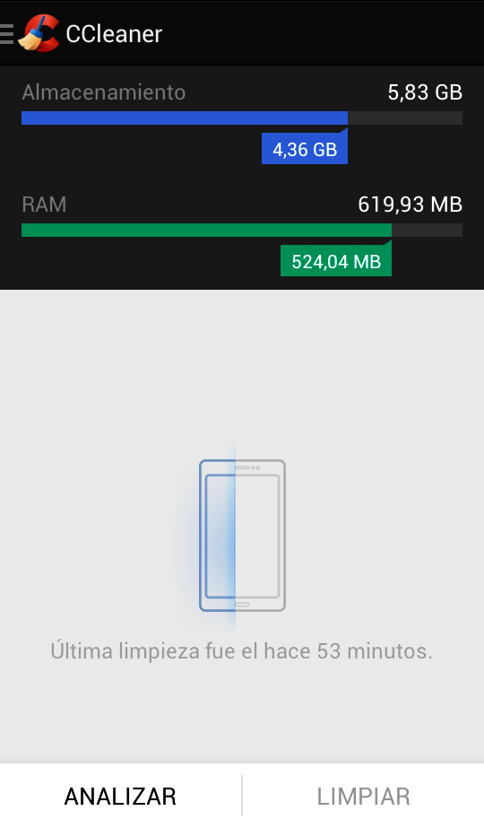 Al entrar a la app lo primero con lo que nos encontramos es con los datos que poseemos tanto en almacenamiento como en RAM, CCleaner nos evalúa el dispositivo y nos dice cuanto poseemos y cuanto tenemos disponible. Nos da la opción de analizar el dispositivo y luego de limpiarlo. Algo a lo que muchos estamos acostumbrados en sus versiones en Windows y Mac.