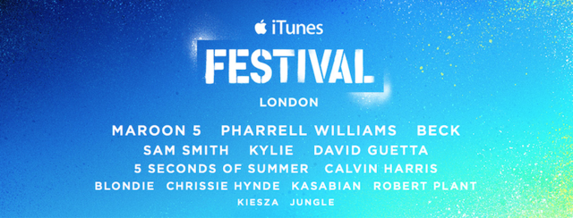 El iTunes Festival contara con mas de 60 actos a lo largo del mes de septiembre, con actuaciones como la de Maroon 5, Pharrell Williams, Beck, Sam Smith, Blondie, Kylie, David Guetta, 5 Seconds of Summer, Calvin Harris, Chrissie Hynde, entre otros.