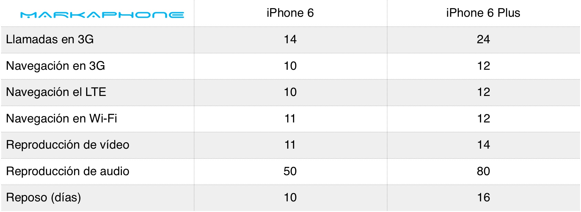 Los números nos muestran que si han mejorado la batería pero no es un cambio radical. En el aspecto donde mejora notablemente es en el reposo, ya que tienen una duración de hasta 2 semanas y 2 días en el caso del iPhone 6 Plus y 10 días en el iPhone 6.