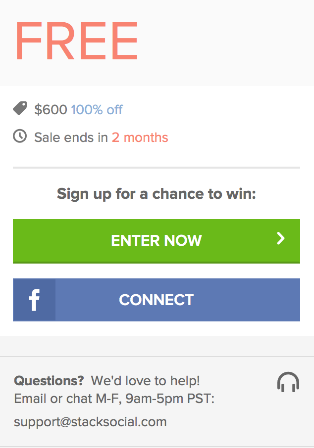 Stacksocial para los que no la conocen es una pagina que ofrece aplicaciones, productos tecnológicos, cursos, todos con precios especiales, y todo esto porque los ingresos van dirijidos a fundaciones beneficas. En estos momentos están haciendo un sorteo con la posibilidad de ganarte un iPhone 6, mas específicamente la posibilidad de ganarte una Gift Card de Apple de 600 dólares para que te compres el iPhone 6 de tu preferencia, solo haciendo un registro con tu e-mail.