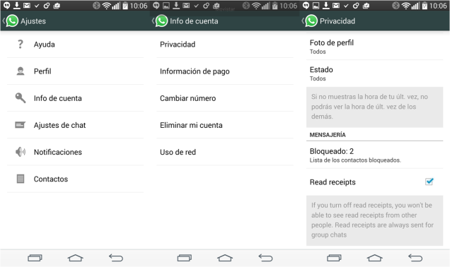 Para buscar esta nueva función, deberás ir a ajustes de WhatsApp, Info de Cuenta, Privacidad y luego desmarcar la opción «Read Receipts». Al desactivar esta casilla ya no podrás ver el doble visto azul.