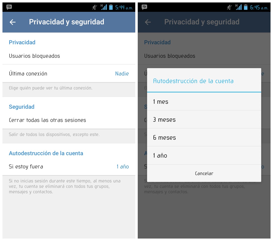 Por ultimo, nos trae la opción de autodestruir nuestra cuenta, la cual funciona de manera que si tenemos un mes o un año sin utilizar la cuenta, esta misma se autodestruira y con ella se borraran absolutamente todos los datos que podríamos haber tenido o compartido dentro de la app, lo que resulta una opción de seguridad muy interesante, si es que algún día decidimos no usar mas la aplicación (Aunque no consigo una razón o motivo para hacerlo).