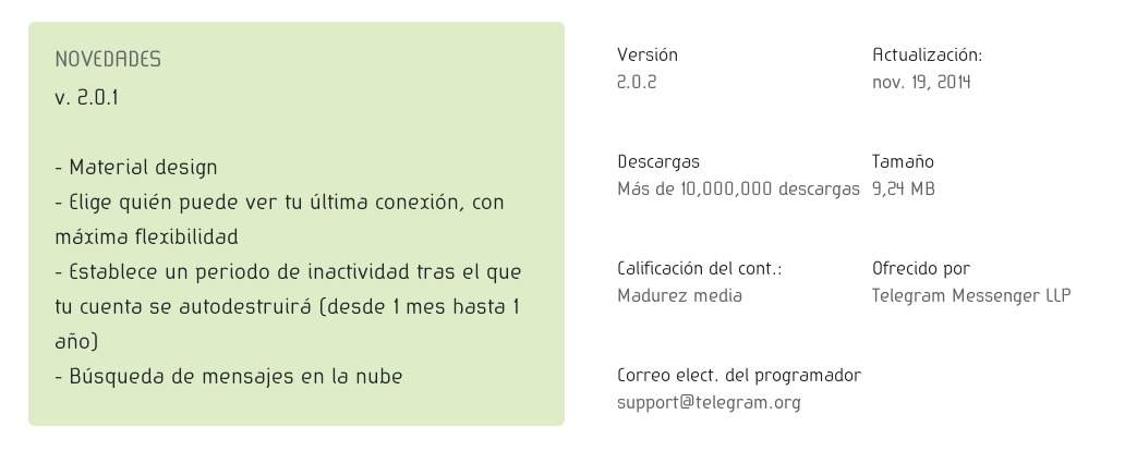 La ultima version disponible de Telegram en la Google Play Store es la 2.0.3, aunque los cambios comenzaron a verse desde la version 2.0.1