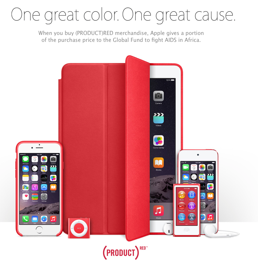 Por otro lado Apple apertura una sección en su Apple Store Online donde ofrece productos como iphones, ipod, case, entre otros de color rojo, donde el dinero obtenido será al igual que las aplicaciones enviado al fondo mundial para combatir el SIDA.