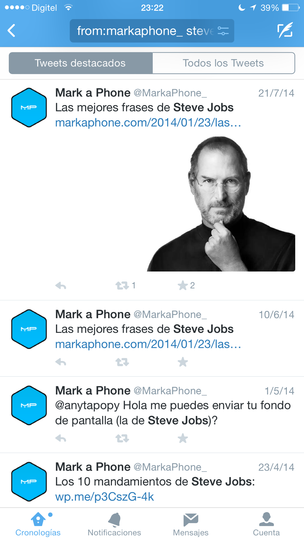 Estas nuevas habilidades en la búsqueda, abren posibilidades interesantes, como la habilidad de encontrar tweets de una cuenta particular, vinculados a una palabra clave; por ejemplo, tweets de la cuenta de nuestro blog con la palabra «Steve Jobs». Para ello debemos utilizar la aplicación oficial de Twitter y en el cuadro de búsqueda colocar: