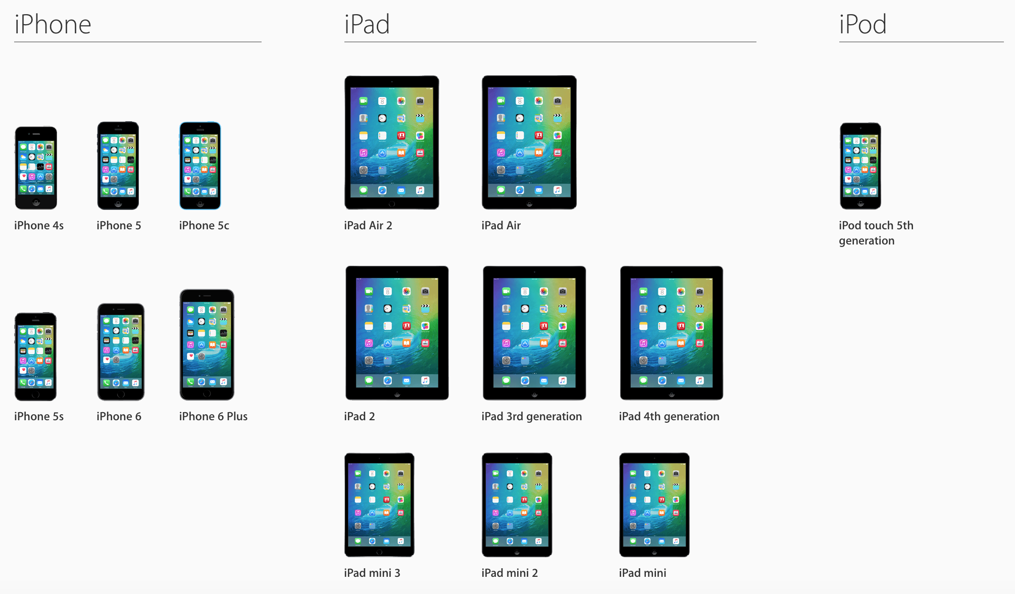 Apple, Noticias Estos son los dispositivos que podrán actualizar a iOS 9 Lista de dispositivos que recibirán iOS 9: iPhone: iPhone 6 iPhone 6 Plus iPhone 5s iPhone 5c iPhone 5 iPhone 4s iPad: iPad Air 2 iPad Air iPad Mini 3 iPad Mini 2 iPad Mini iPad 4ta Gen iPad 3ra Gen iPad 2da Gen iPod: iPod Touch 5ta Gen Comparte: Haz clic para compartir en WhatsApp (Se abre en una ventana nueva) WhatsApp Haz clic para compartir en X (Se abre en una ventana nueva) X Haz clic para compartir en Facebook (Se abre en una ventana nueva) Facebook Relacionado