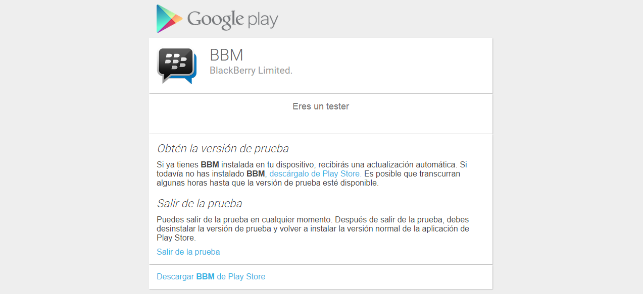 3.- Después de haber aceptado la invitación, deben ingresar a la pagina de la Play Store para unirse a la comunidad Beta Tester de BBM para Android y así finalmente, poder acceder a descargar la nueva actualización en versión prueba de BBM.