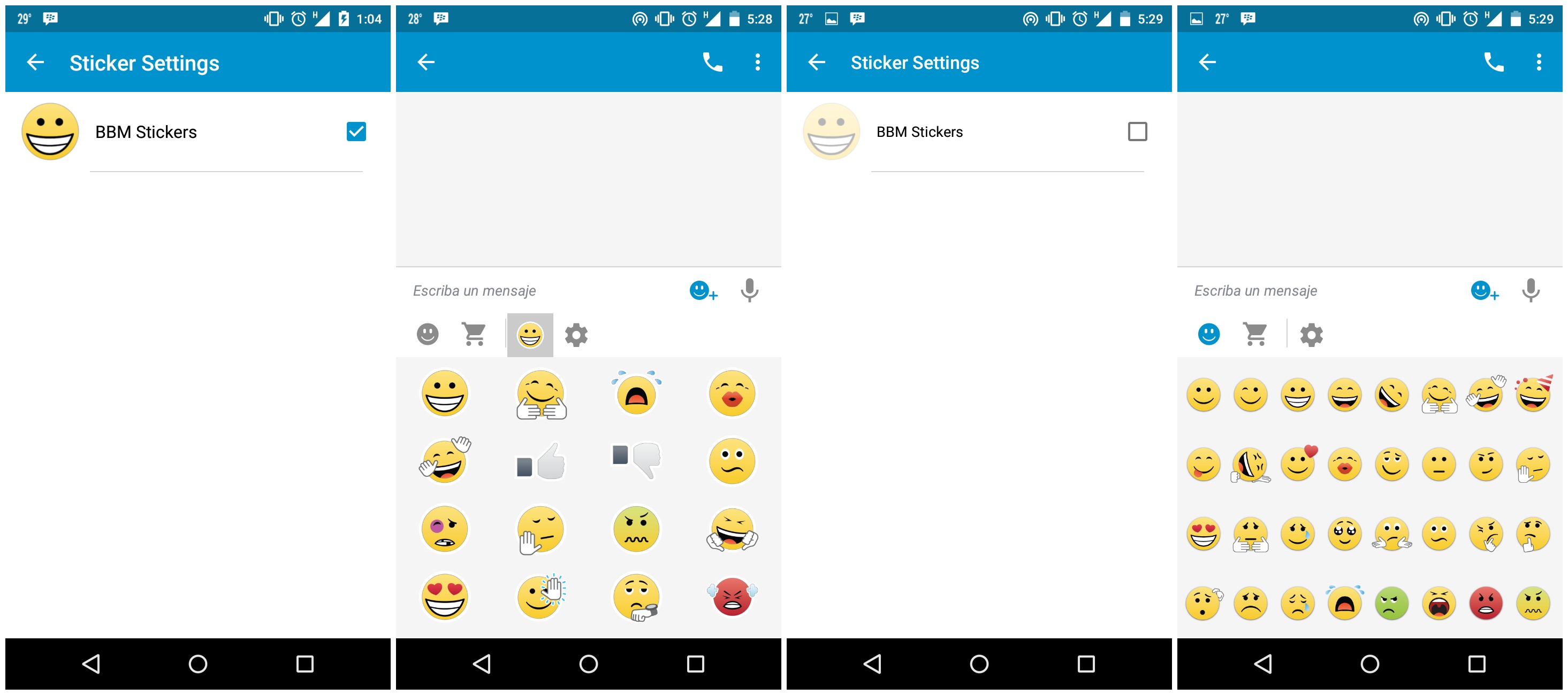 Finalmente se ha añadido la opción de habilitar/deshabilitar los Stickers, por lo que si lo deseamos, podemos deshabilitarlos y dejar de encontrarlos en primera instancia a la hora de querer enviar un emoticon en vez de un Sticker, algo que muchísimos usuarios de la comunidad de BBM para Android se ha quejado en los últimos meses, ahora se puede corregir manualmente a gusto de cada usuario.