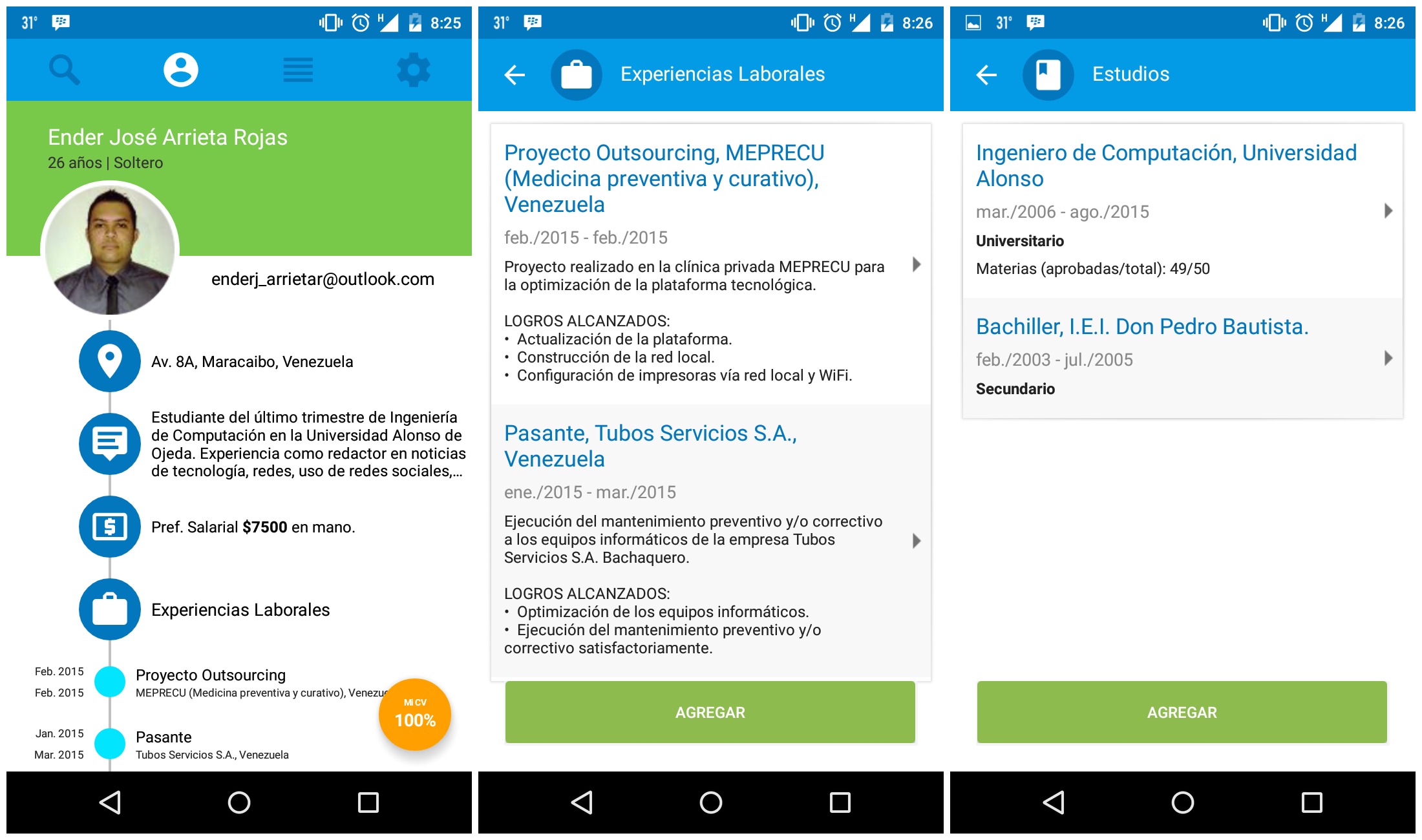 Ahora con su completo y nuevo diseño Material Design, podemos notar una frescura y rapidez en su aplicación para Android, y resulta mucho más cómodo conseguir los apartados de «Mi CV», «Experiencias Laborales» y «Estudios», donde al completarlos con toda tu información como profesional, podrás ver el botón de acción de la esquina inferior derecha (característico de Material Design), como dice «Mi CV 100%», lo que ahora te indicará cuando hayas llenado toda la información correspondiente.