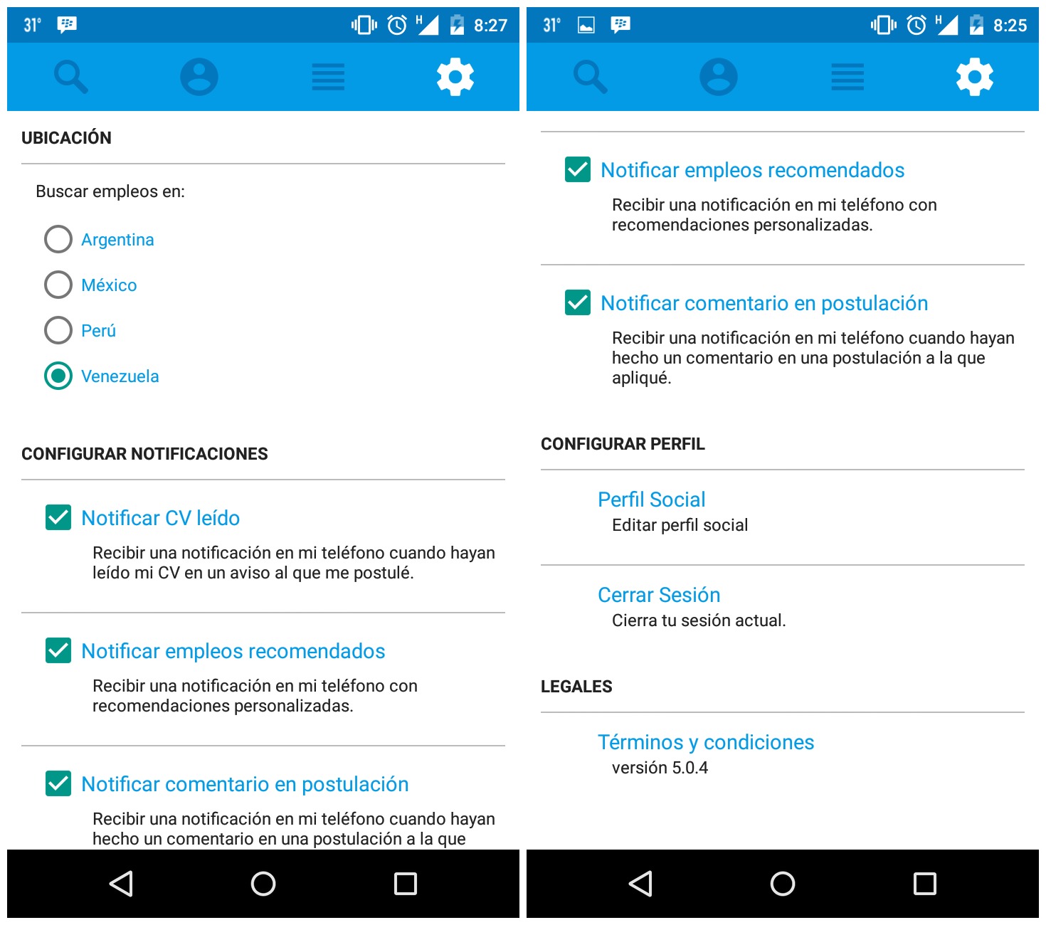 En el apartado de «Preferencias» podemos ver la amplitud que tiene la aplicación de Bumeran a la hora de buscar empleos en 4 países sumamente importantes de latinoamerica, como lo son: Argentina, Venezuela, Perú y México, teniendo un buen soporte para todos los usuarios que pertenezcan o estén residenciados en esos países, también podemos configurar las notificaciones que deseamos recibir y nuestro «Perfil social».