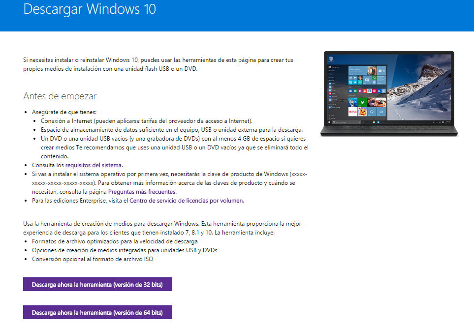 Para descargar el ISO debéis dirigiros a esta dirección web: Descargar Windows 10, entonces elegirás la opción adecuada según el procesador y sistema operativo que uses (32 o 64 bits).