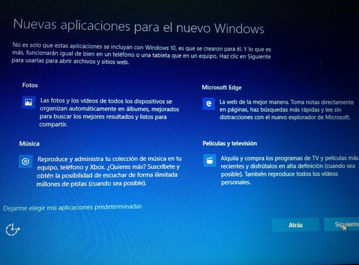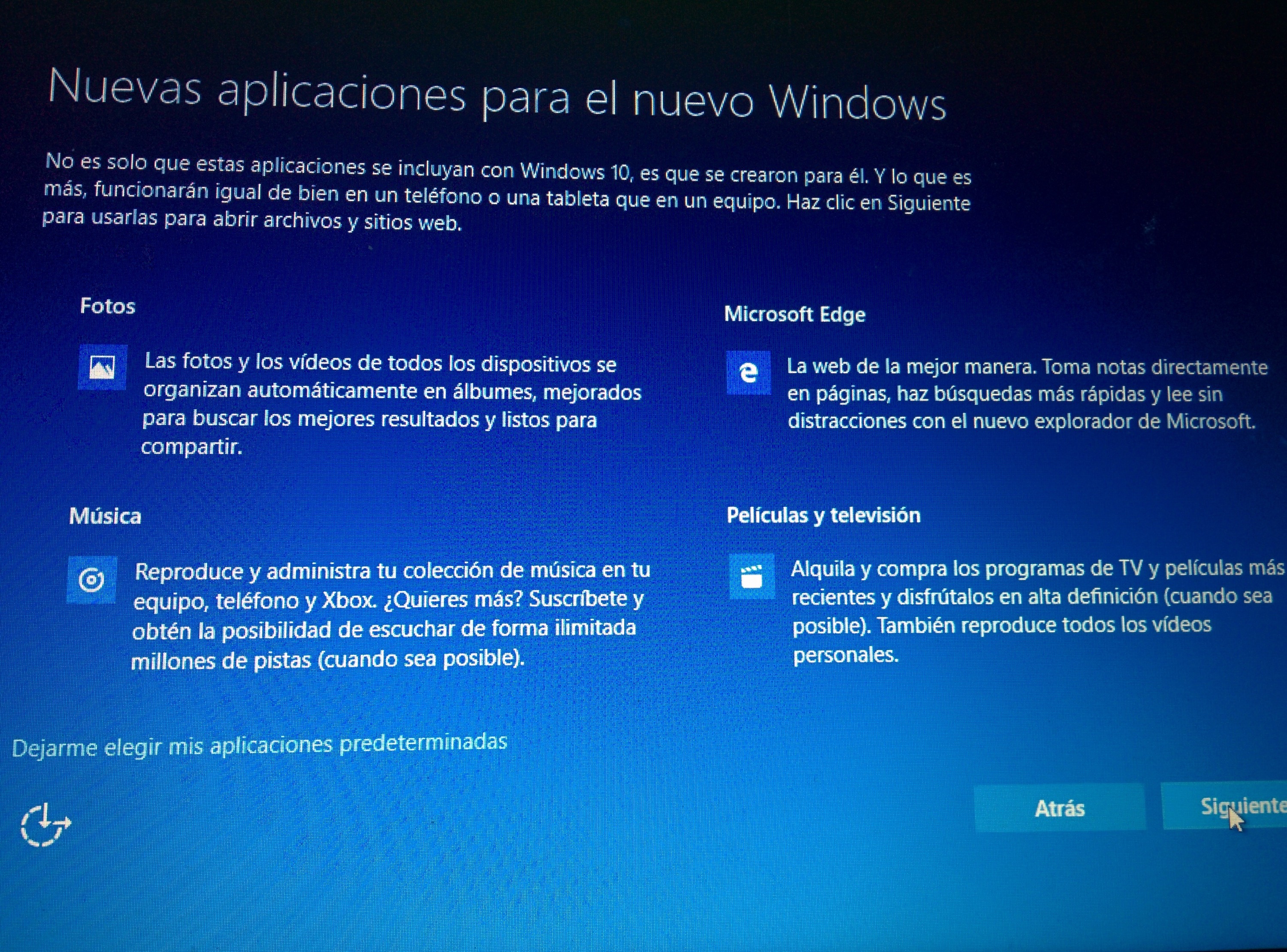 Una vez lo hayas descargado una de las primeras cosas que te mostrara son las principales aplicaciones propias de Windows 10, aplicaciones que han sido creadas en exclusivo para este OS, podremos elegir las que queremos tener en forma predeterminada seleccionando: Dejarme elegir mis aplicaciones predeterminadas, o por el contrario puedes pulsar siguiente y el sistema directamente instalara de forma predeterminada todas las que trae.