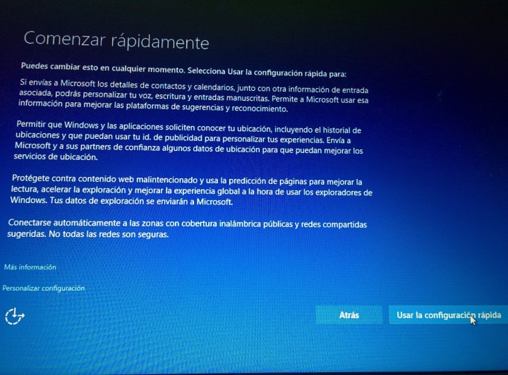 En la siguiente pantalla tendrás que elegir nuevamente, o bien usar la configuración rápida, que es la predeterminada de Windows o mas bien personalizarla a tu gusto, personalmente recomiendo esta ultima a opción solo si eres una persona que tienes al menos unos conocimientos medios de informática.