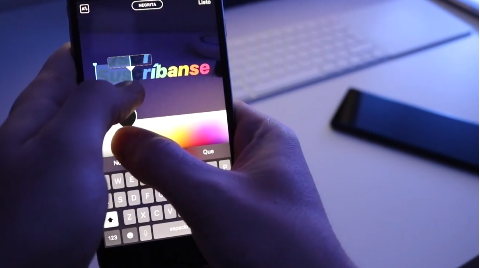 Escribe una frase o una palabra, luego selecciona todo el texto, y con un dedo desliza de izquierda a derecha (o viceversa) y con otro dedo deja presionado un color y desliza en la paleta de colores. Tienes que hacerlo en forma simultánea.