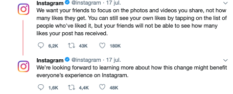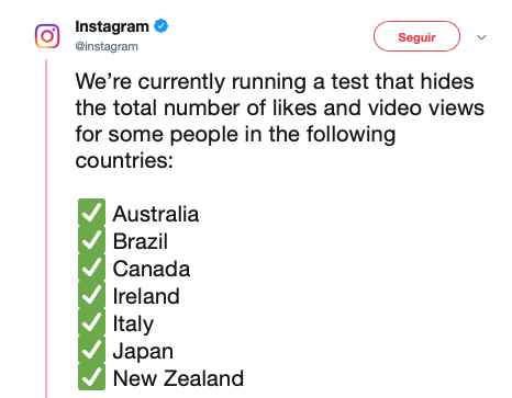 Una de las primeras redes sociales en hacer este cambio es Instagram, que comenzó a ocultar los likes en algunos países. En Australia, Nueva Zelanda, Japón, Irlanda, Canada Italia y Brasil. Ya el espectador no podrá saber si esa foto tiene mucho éxito o todo el mundo le da like, sino que ahora está oculta y sólo el que publicó la foto puede ver las estadísticas de la publicación