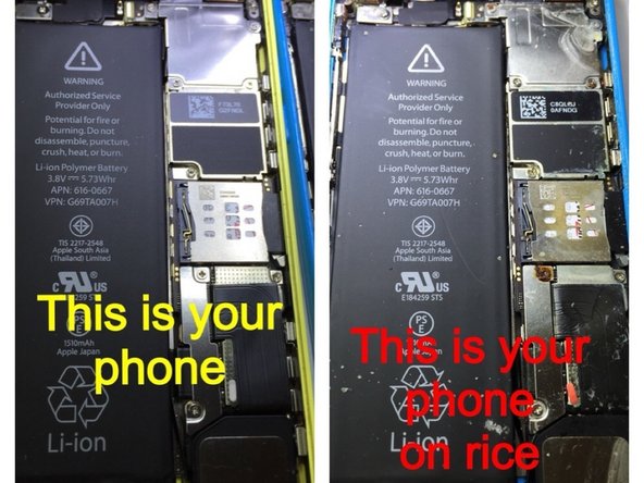 Según la empresa reconocida IFIXIT, una de las mas influyentes en reparaciones de dispositivos móviles, nos dice que el arroz puede empeorar la situación. En esta foto vemos un teléfono sin arroz y otro luego de secarlo con arroz, donde pueden entrar pequeñas partículas dentro del dispositivo algo nada aconsejable y del mismo modo el arroz no absorbe el agua ni la humedad del interior.